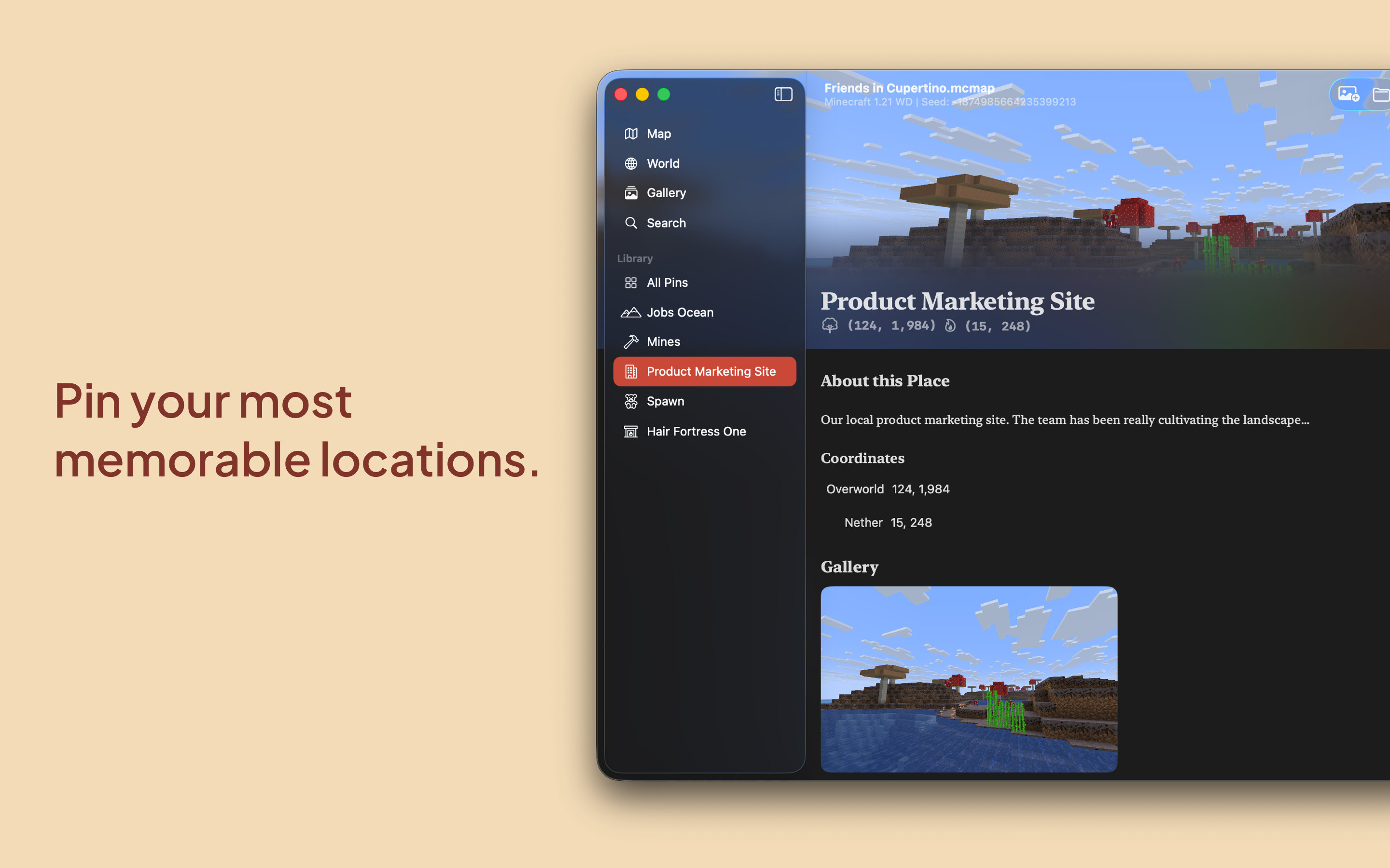 Pin your favorite or frequently visited locations easily. Give them a color and name, add screenshots from your world, and write descriptions that best work for you.