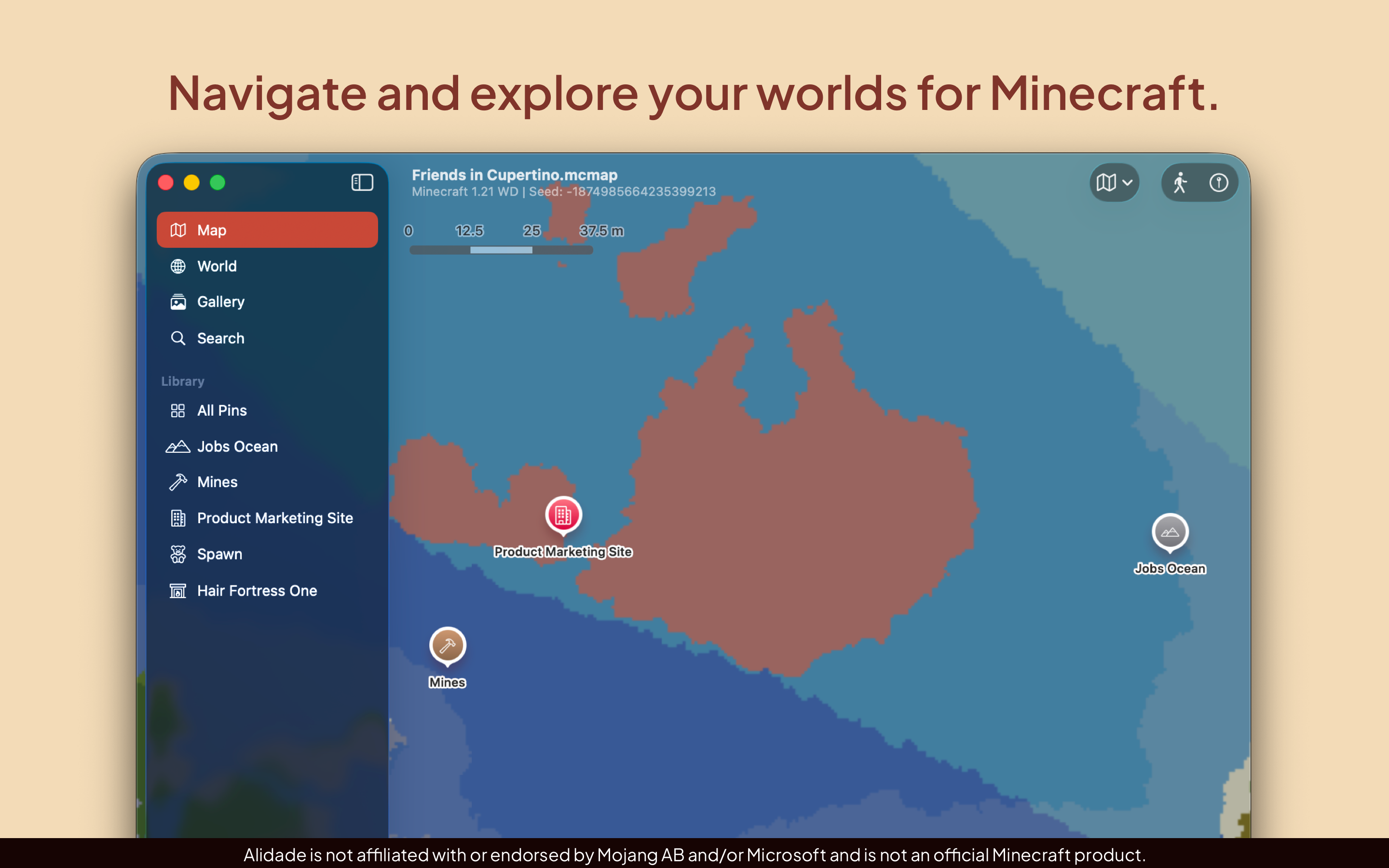 Alidade is not affiliated with or endorsed by Mojang AB and/or Microsoft, and it is not an official Minecraft product. Minecraft is a registered trademark of Mojang AB and Microsoft Corporation. iCloud, Mac, iPhone, iPad, and iCloud Drive are registered trademarks of Apple Inc.