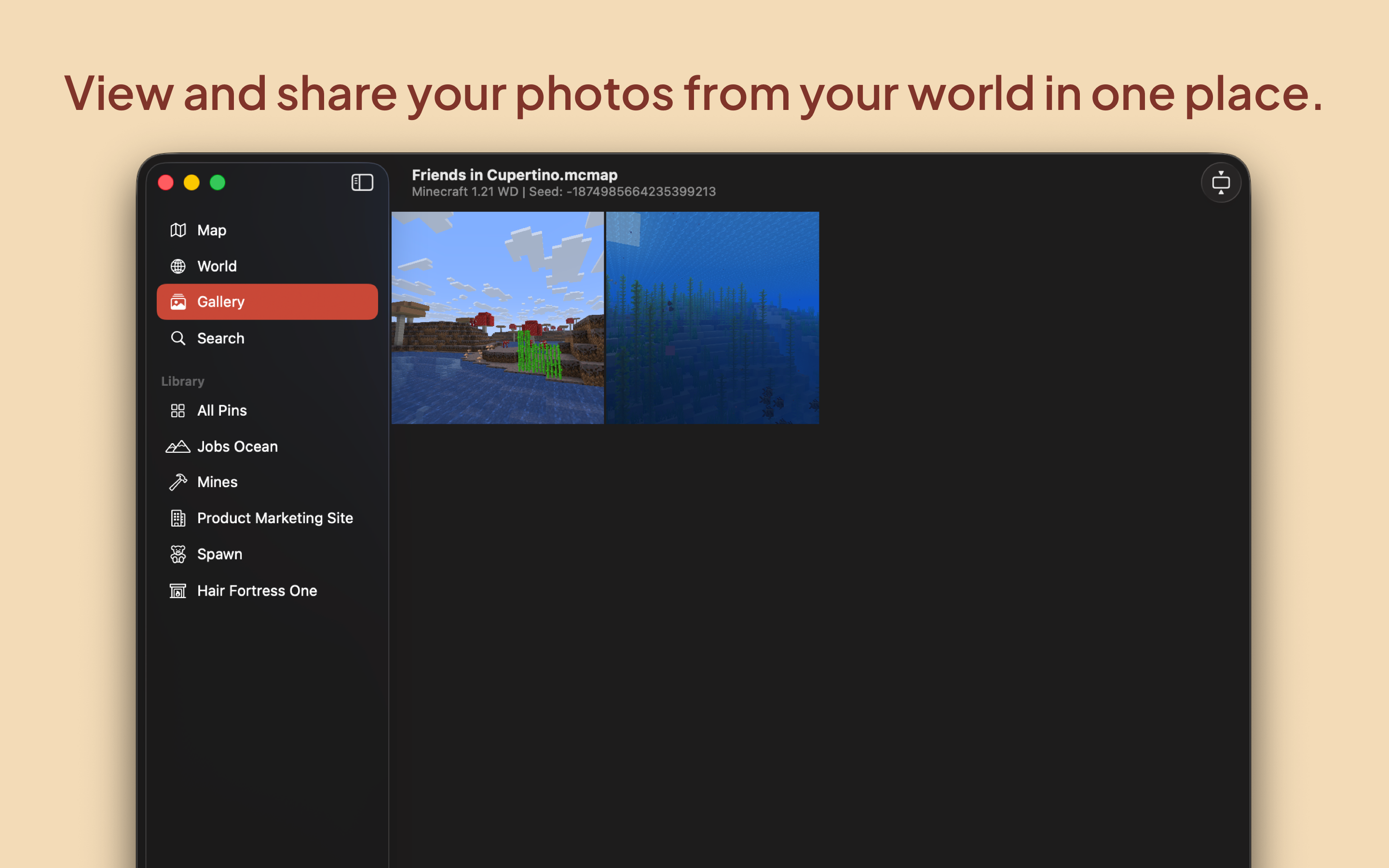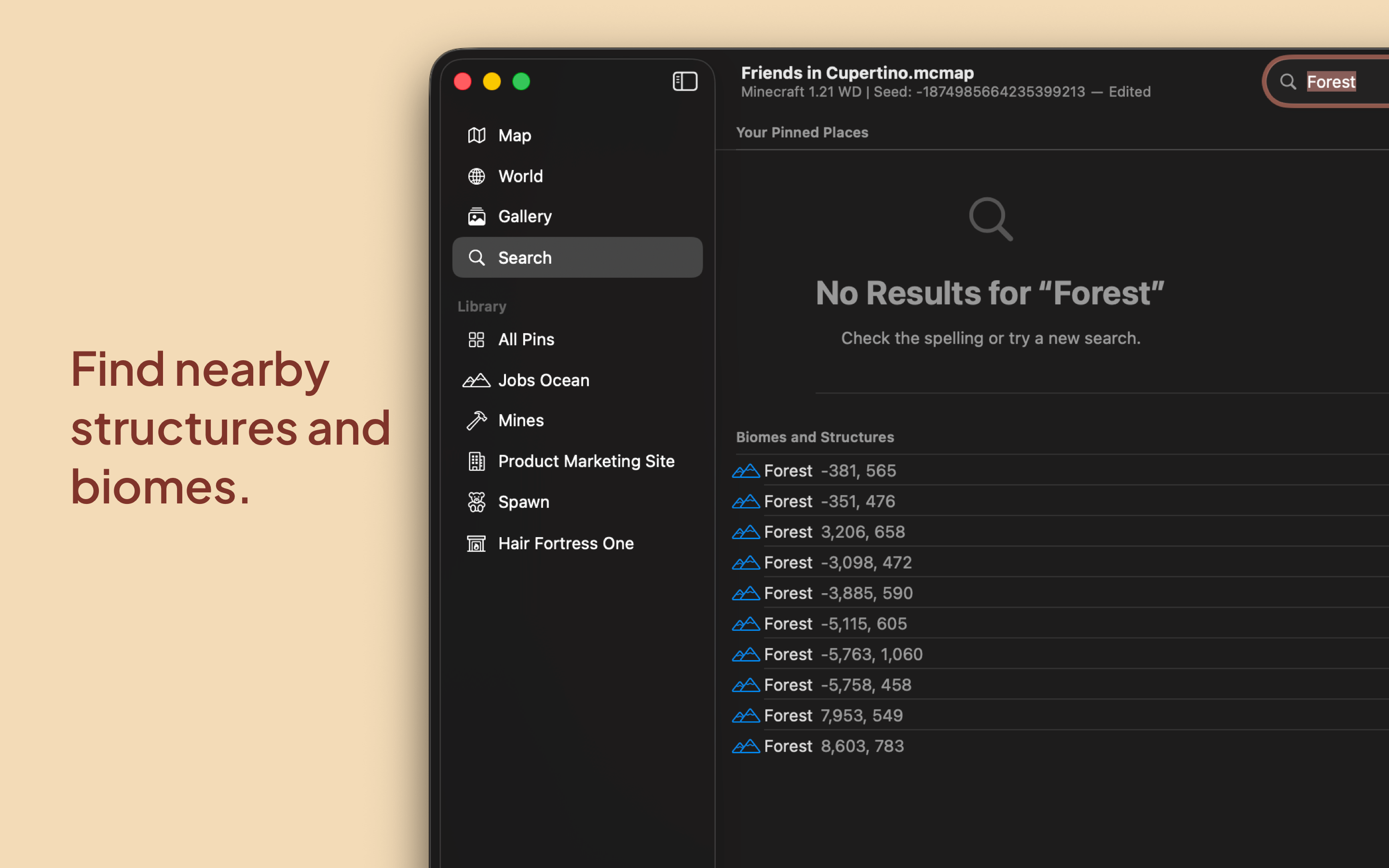 Navigate and explore your worlds across Mac, iPhone, and iPad for Minecraft Java Edition. Quickly locate nearby structures and biomes with a search. And pin your favorite or most memorable locations with photos, descriptions, and more.