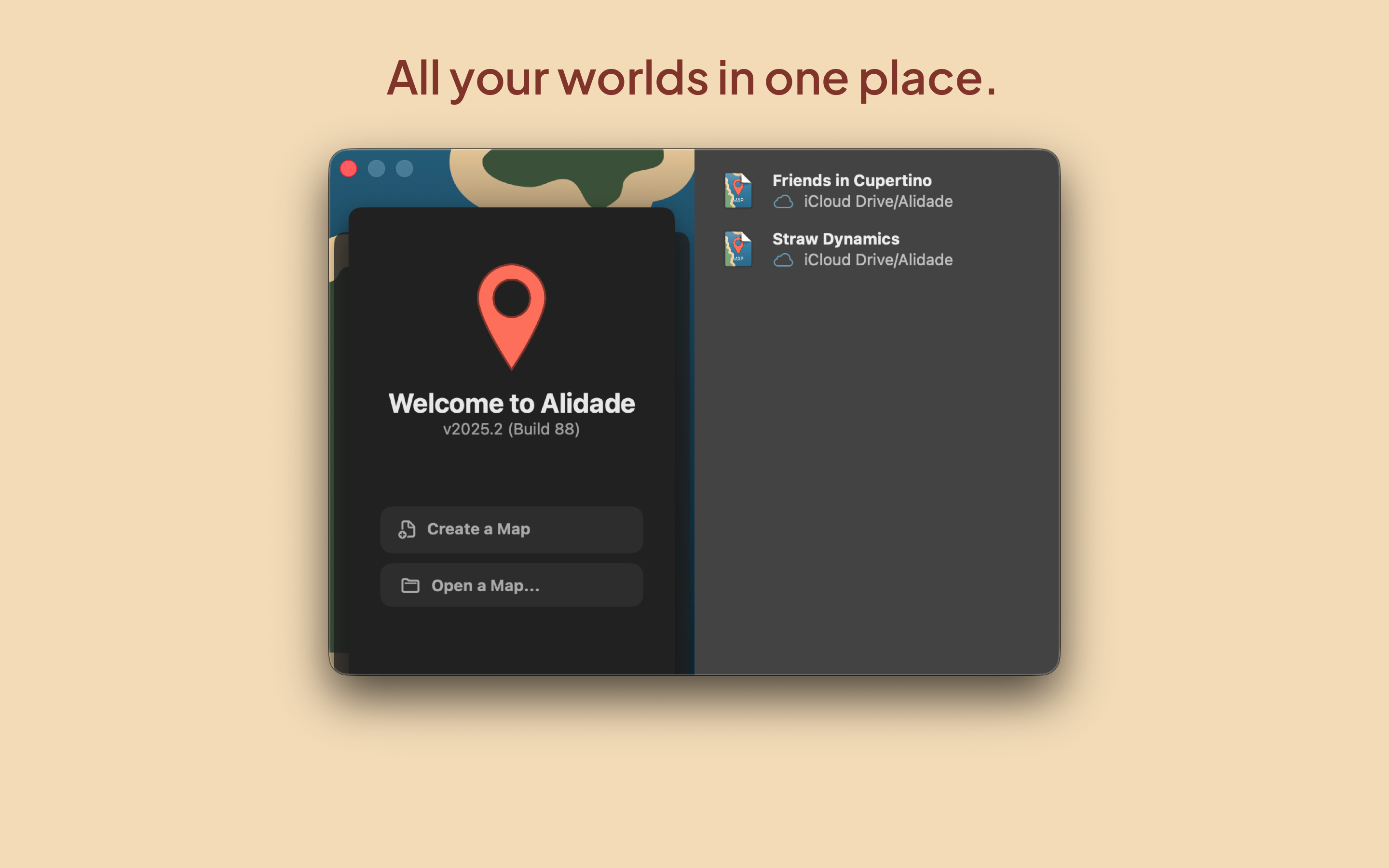 Alidade stores your worlds as files that you can easily work with. Save them to your device, move them to iCloud Drive, or place them wherever you like. And even share them with your friends easily.