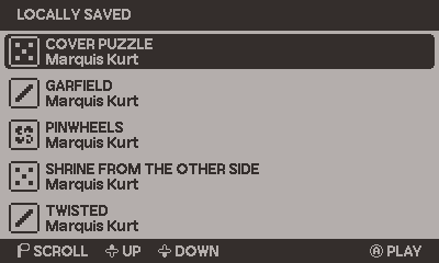 In game, these puzzles will display in the puzzle picker under the game’s name. Shared games will have a Playdate icon next to their name to indicate it has been shared by that game.